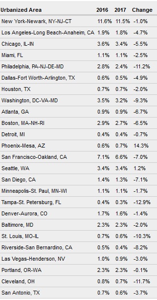 You can download the Antiplanners updated summary of the 2017 National Transit Database to get my calculations of transits share of travel. I copied the daily VMT from table HM-72 into cells AR3881 through AR4367, converted to passenger miles in the adjacent (AS) column, and calculated transits share in the AT column. Transit passenger miles are in column L. A handful of urban areas (such as Nampa, Idaho) are in the National Transit Database but not Highway Statistics, while two (Norman, OK and Middletown, NY) are in Highway Statistics but not the National Transit Database.